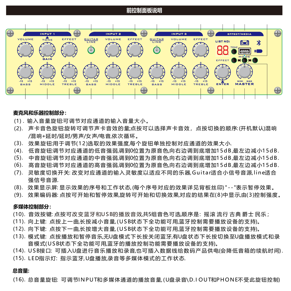 - 输入口2:带声卡和3段均衡的麦克风通道(6.5插孔)