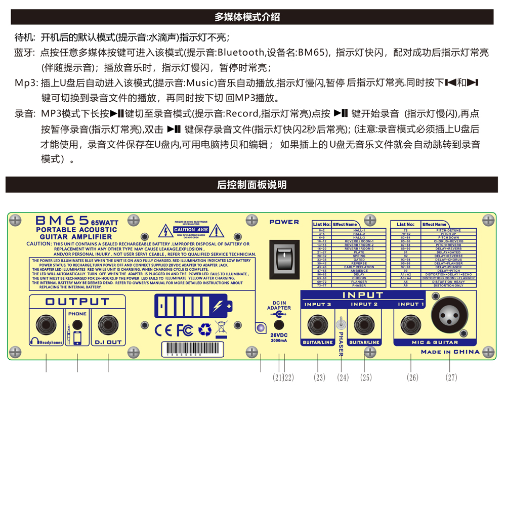 - 效果器:可断电记忆106种效果,数码管显示