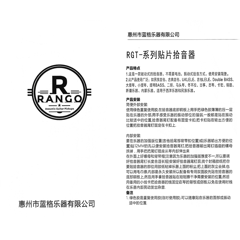 RANGO RGT2 手工拾音器 两贴片(乐器通用)